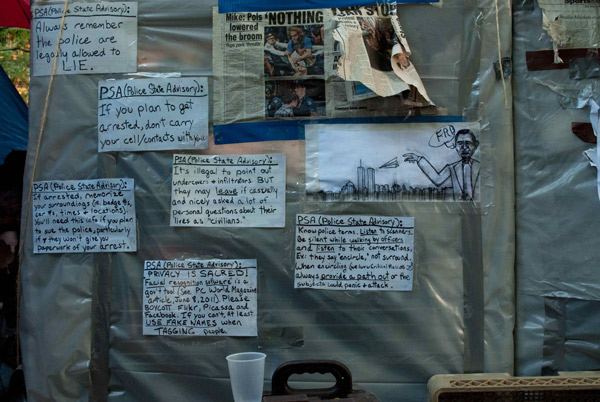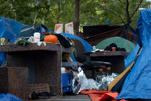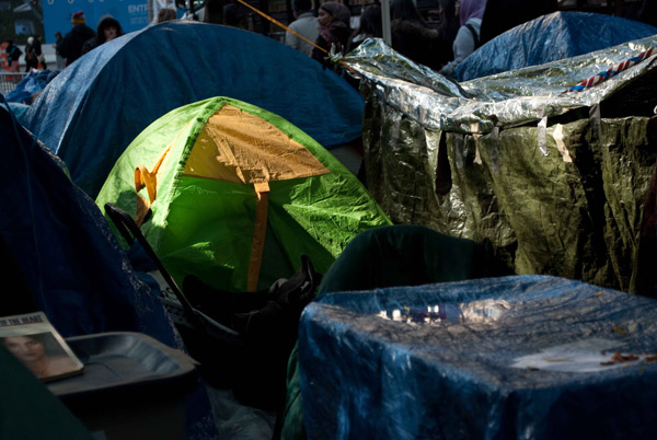 Debo decir que fue una visión decepcionante. Un plaza empapada donde los policías parecían estar cuidando ropas, colchas y carpas tendidas para secarse de la lluvia. Se veía pocos “ocupantes” y muchos mirones con cámara como yo.