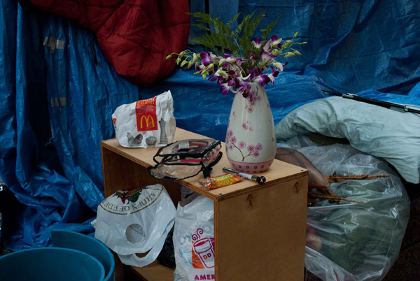 Me metí por entre las carpas y fotografié la intimidad de la vida de los que viven ahí: su ropa mojada, sus bolsas de macdonalds y donkindonuts, sus pantuflas y detalles como mascotas y floreros con flores frescas puestos a los lados de las carpas.